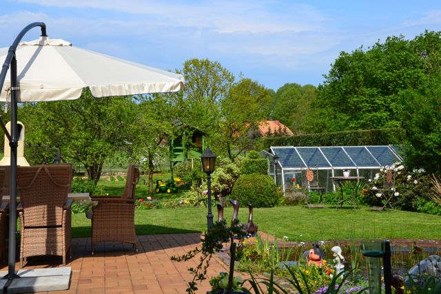 Zur Erholung stehen außerdem ein Grillplatz mit Sitzgruppe direkt am Gartenteich und eine Liegewiese zur Verfügung.