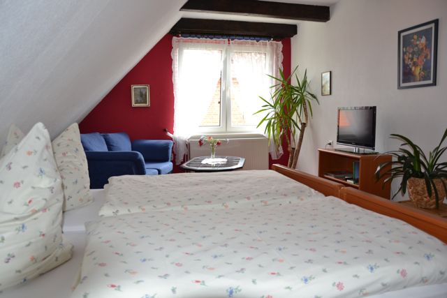 Unser Gästezimmer ist liebevoll und gemütlich eingerichtet, verfügt über einen Fernseher und ein kleines Bad auf der ersten Etage. Sie schlafen im Obergeschoss in einem bequemen Doppelbett. Bettwäsche ist natürlich vorhanden! Hier ist Platz für bis zu zwei Personen.